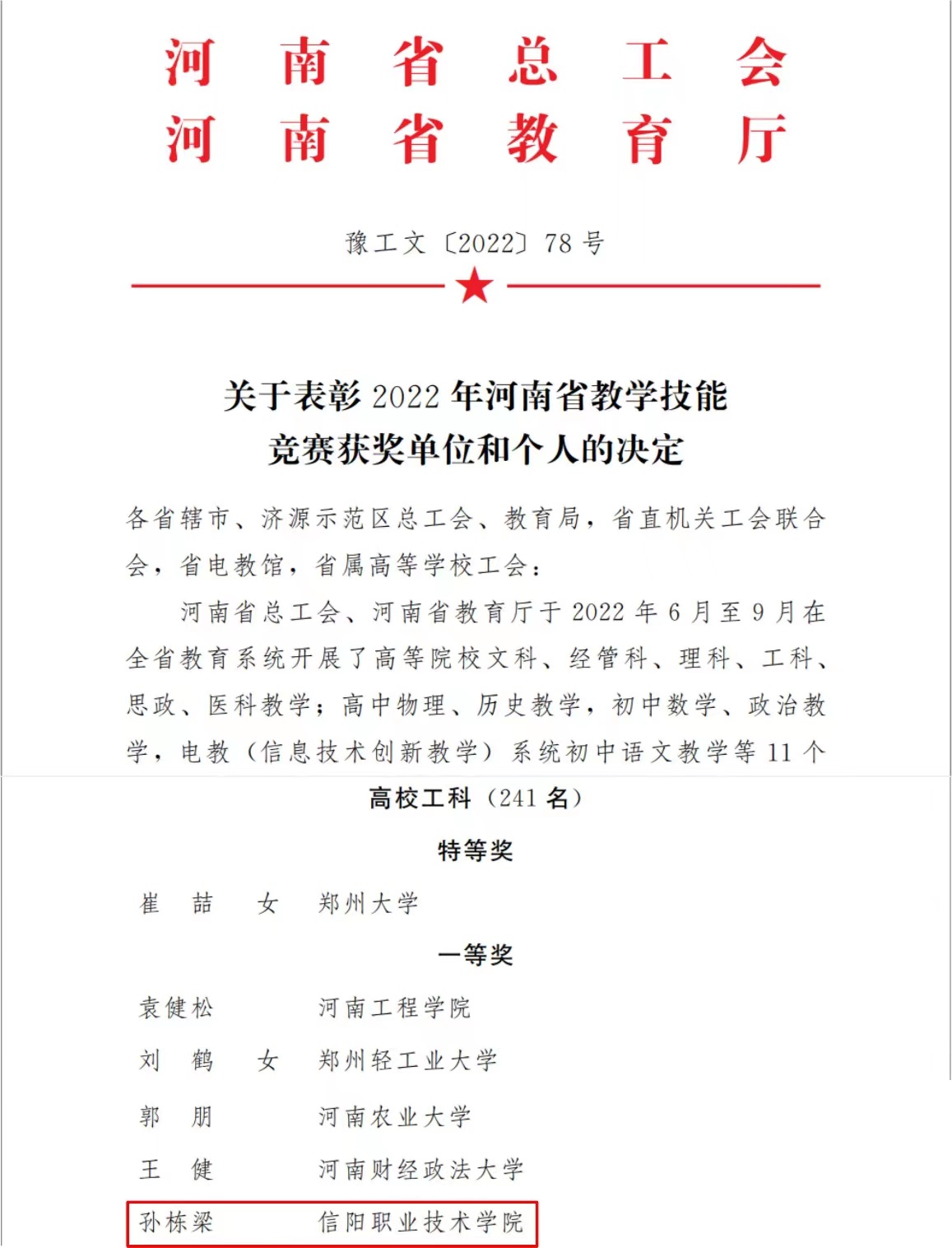 2022年9月16日,由河南省总工会、河南省教育厅主办,河南省教科文卫体工会以及洛阳理工学院承办的河南省教育系统2022年度教学技能竞赛(现场决赛)落下帷幕。信阳职业技术学院大发体育平台教师孙栋梁进入决赛,荣获高校工科组一等奖,被授予“河南省优秀教学标兵”荣誉称号。